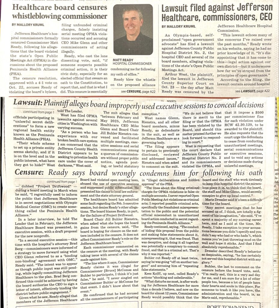 Jefferson Healthcare Commissioner Matt Ready was formally censured by a 4–1 board vote Wednesday night. He contends the resolution contains multiple false statements, asserts that corporate loyalty supersedes the law, and represents retaliation for his efforts to expose violations of Washington’s Open Public Meetings Act and to report potential criminal conduct to authorities.