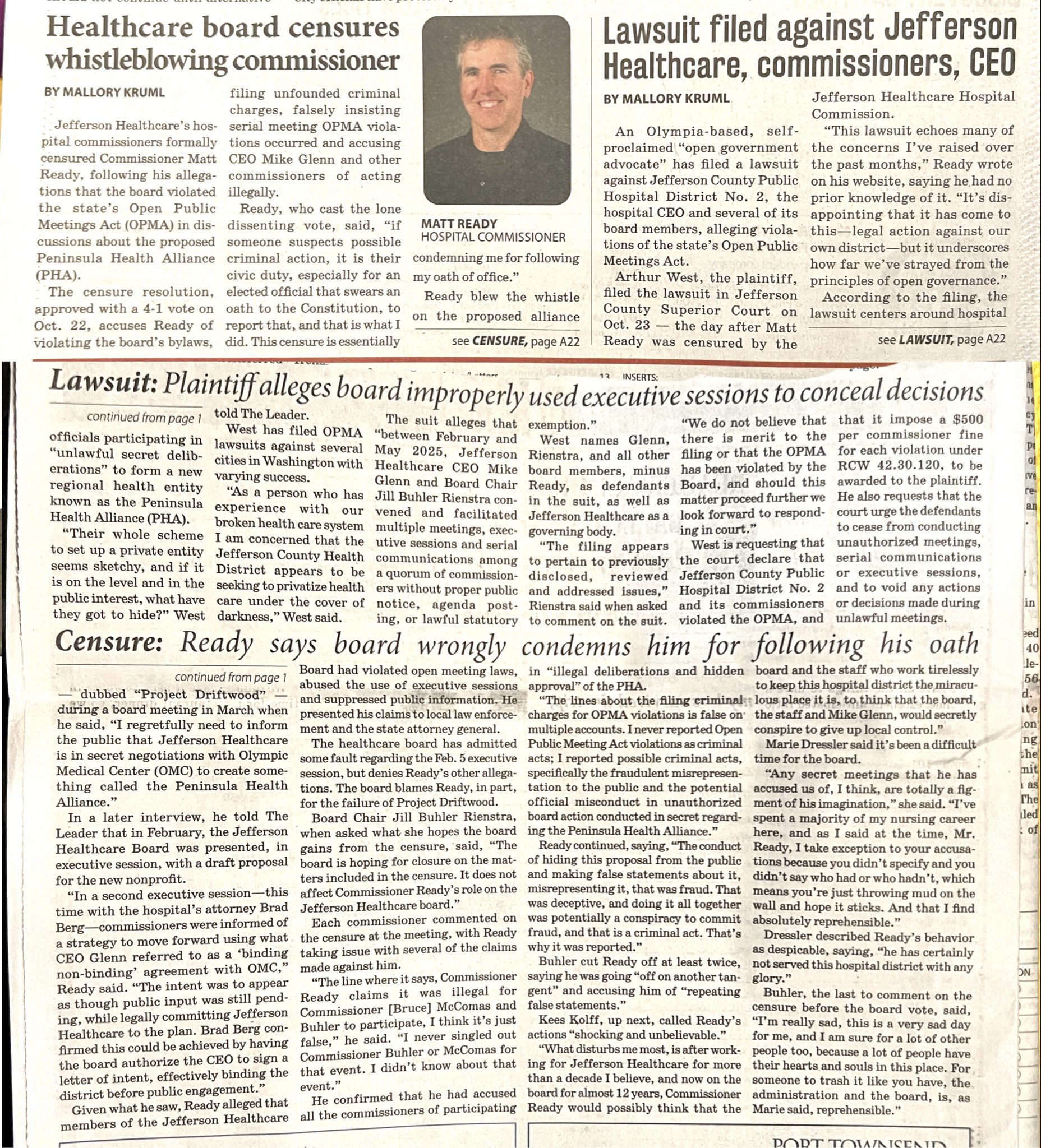 On October 22, 2025, the Jefferson County Public Hospital District #2 Board of Commissioners voted 4–1 to censure Commissioner Matt Ready, who cast the lone dissenting vote.